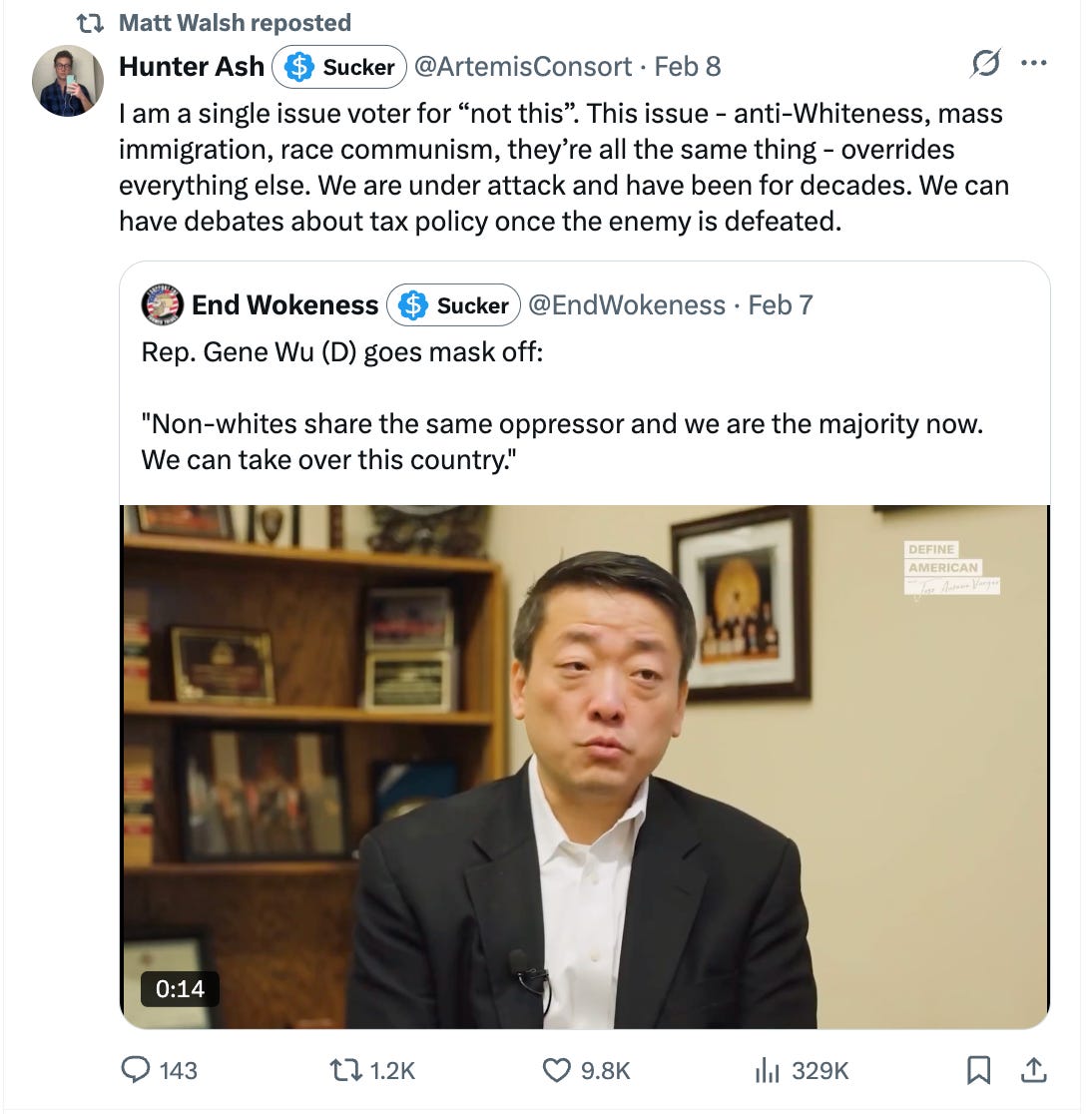 He then retweeted a post from one Hunter Ash, the social media manager for Keeper, an AI matchmaking startup recently profiled in The New York Times, who tweeted, “I am a single issue voter for ‘not this’. This issue - anti-Whiteness, mass immigration, race communism, they’re all the same thing - overrides everything else. We are under attack and have been for decades. We can have debates about tax policy once the enemy is defeated.”