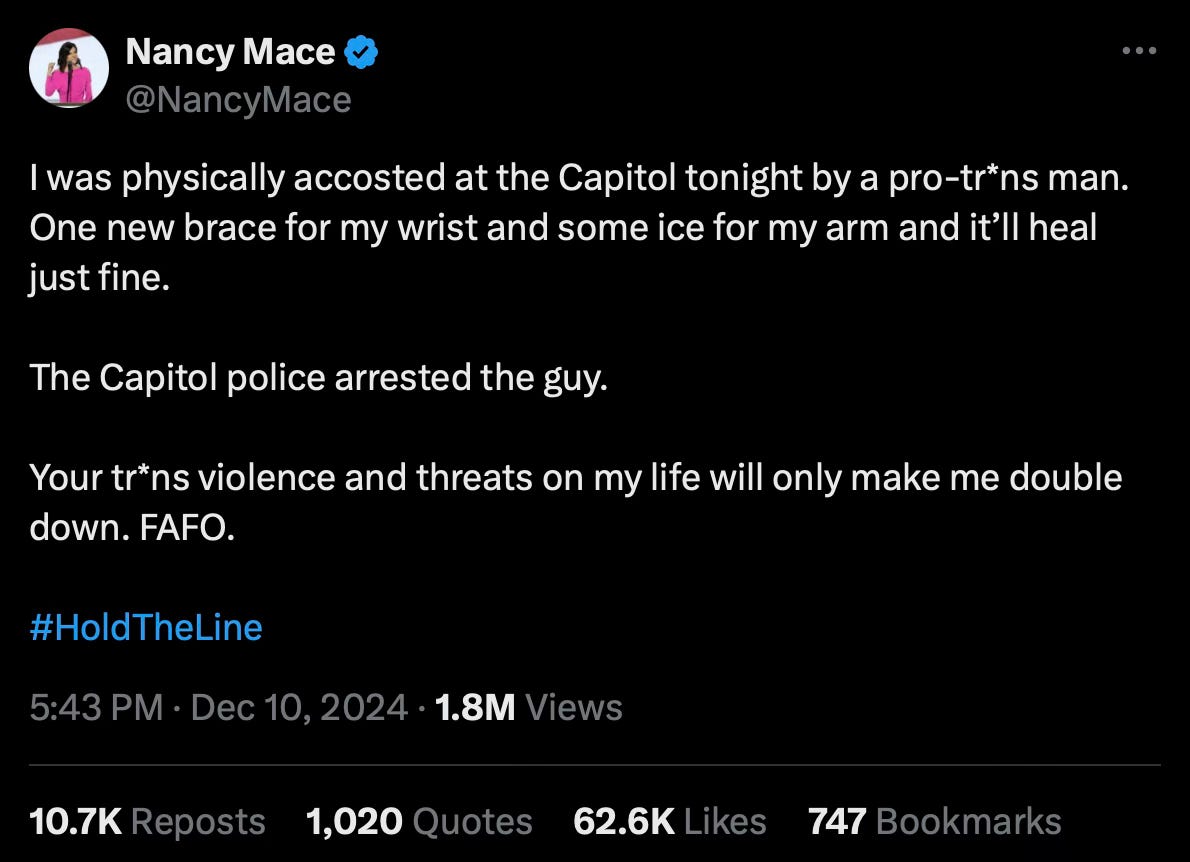 You know folks, I admit there's room to be ambivalent about wondering out loud if Mace has a penis or if her face is a little too masculine to believe she's cis or whatever. We're all pissed and we're all hurt and we're all dealing with it the best we can. But as the author of this piece, right here, right now, I'm asking you to refrain from public skepticism of Mace's sex OR gender.
