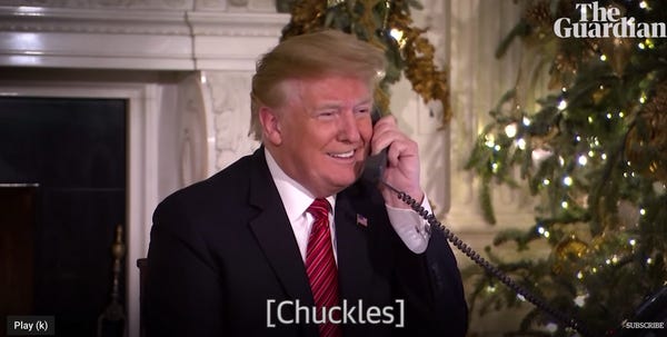 Step with us into Obama's time machine back ten thousand years to Christmas 2018. Whoosh whoosh wavy lines! Trump was answering calls on the NORAD Santa tracker, which along with "scrubbing oil off rocks" is our favorite use of the military. Donna Rose called up that year (I think?) and thought she was talking to Santa Himself, shouting SANTA SANTA ARE YOU COMING TO MY HOUSE?, and dude on the other end (NOT DONALD TRUMP) was just seamless about it. It was really sweet!