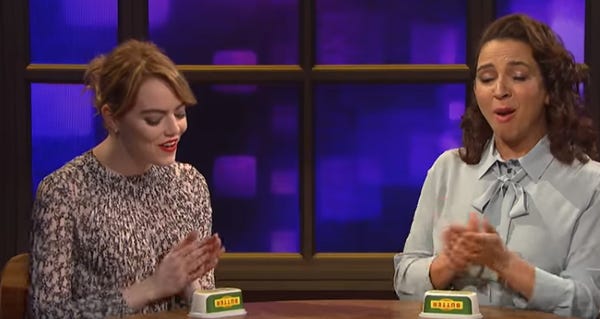Well hey there, Wonkers, it is Wednesday, which means it's time for your weekly dance party! And what do we even mean when we say Maya Rudolph plays the butter tub better than you (or your mother) do? Well! On the NBC teevee show "Maya & Marty," Rudolph pulled off another one of her hilarious musical stunts, this time with movie acting lady Emma Stone. They used butter tubs as musical instruments! They did the song "Call Your Girlfriend" by Swedish pop superstar Robyn, playing butter tubs and singing at the same time! It was ... well dang, it was pretty impressive, just like it usually is when Maya Rudolph brings her musical chops out to play.