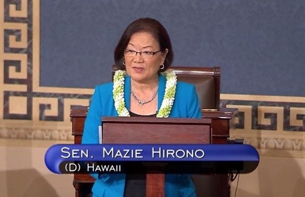 There's just something relentlessly nice about Mazie Hirono. Not that she's a pushover or anything, but she's also such a fundamentally decent human being who embodies so much of what Democrats stand for. It's worth noting that when Republicans were trying to murder Obamacare last year, while John McCain got all the attention (and all the Trump hate) for his decisive vote against repealing the ACA, McCain wasn't the only member of the Senate fighting cancer. Hirono had been diagnosed with Stage 4 kidney cancer in May 2017, and gave a hell of a speech about the pure meanness of stripping insurance coverage from tens of millions of Americans, even as her colleagues (all with good insurance) had wished her well in her own (well-insured) treatment:
