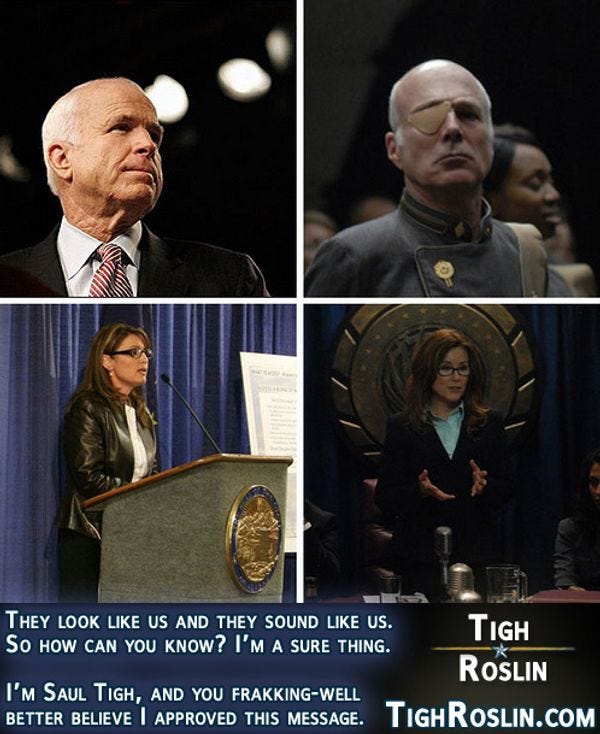Something sort of familiar about scary old McCain and shrill Mrs. President Palin? Yes, they are the space monsters from teevee'sBattlestar Galactica-- the doomed leaders of a spaceship filled with frantic losers running for their lives from the PLANET THEY DESTROYED ... we think. We have not actually watched this show, but we vaguely recall the terrible original version from 1942. You people, in the comments, will very quickly display an encyclopedic knowledge of the show, and how it proves McCain-Palin will destroyourplanet, too. [ Tigh-Roslin 2008 via Cryptogon ]