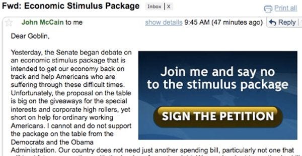 So this time, he wants you to know that despite flying to Chicago to kiss Obama's ring a few months back, and supporting pretty much whatever Obama wants, he will NOT STAND for this huge stimulus pork-and-beans bill, which he probably endorsed until this morning. And everybody on John McCain's email list hates him, for being a liberal loser, so they just all deleted his email, the end.