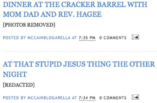 John McCain has so many wives and daughters, it's hard to keep track of which one has the dumbest blog. Oh, right, it's Meghan McCain who has the dumbest blog. But this one, whichmaybe is a joke, is also dumb. [ McCainBlogarella ]