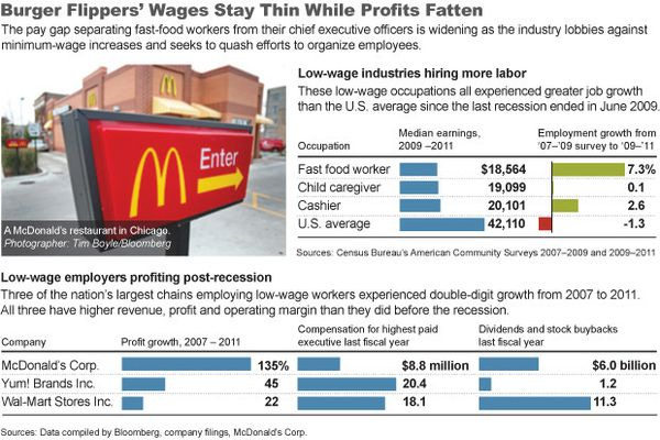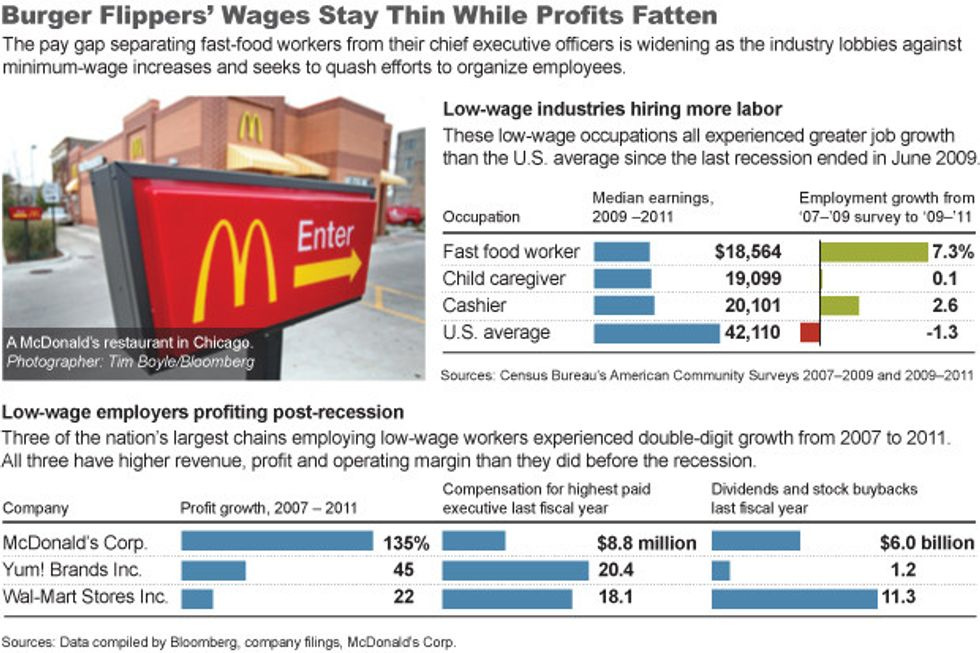 Fast-food restaurants have added positions more than twice as fast as the U.S. average during the recovery that began in June 2009. The jobs created by companies including Burger King Worldwide Inc. and Yum (YUM)! Brands Inc., which owns the Pizza Hut, Taco Bell and KFC brands, are among the lowest-paid in the U.S. -- except in the C suite.