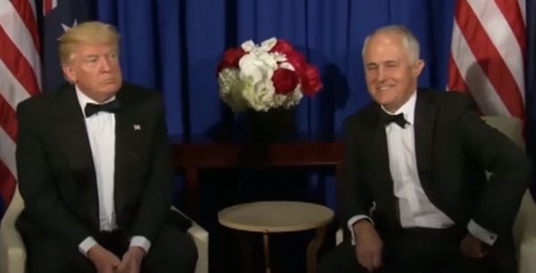 Remember that time Donald Trump had been president for barely five minutes and figured a really good way to assert his newfound authori-tah would be to make phone-yells at Malcolm Turnbull, prime minister of Australia, which is (geopolitical fact) one of America's strongest allies? Trump yelled at Turnbull about refugees and then really showed Turnbull his anus by bragging about how big his Electoral College win was. Turnbull was obviously very impressed, and the White House's excuse for one of the first of Trump's many presidential fuck-ups was that it was like FIVE PM (not kidding!), which meant he was far too sleepy and full of diaper-poo to do proper presidenting.