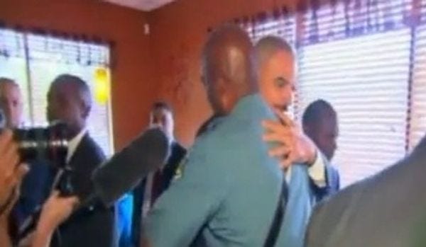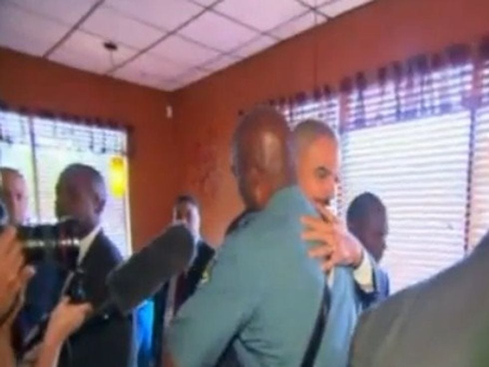 "My man. You are the man," Holder greeted Johnson as they embraced in front of a gaggle of cameras. After whispering something in his ear, Holder asked Captain Johnson whether he was getting enough rest. Johnson said he'd come home recently to find a card on his pillow from his sleeping wife, wishing him a happy 26th anniversary.