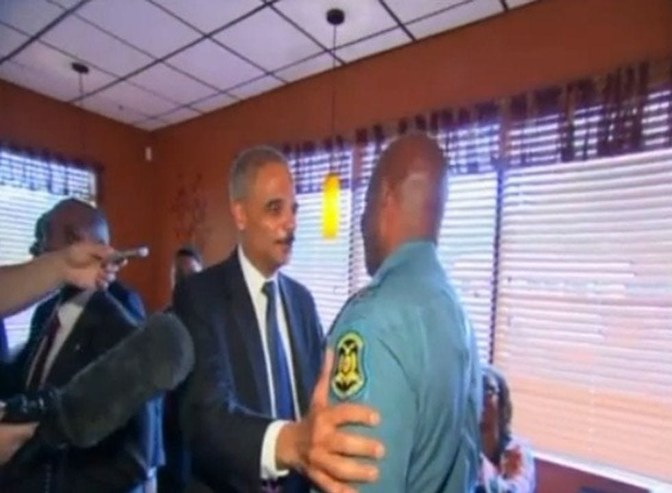 Attorney General Eric Holder spent Wednesday checking on the progress of Barack Obama's tyrannical federal takeover of Missouri, and while he was there, he had what we assume is a totally coincidental path-crossing with Ron Johnson, captain of the State Highway Patrol and Guy Who's In Charge Around Here . Holder had taken a break from inspiring local community college students and usurping the state's right to gloss over its own (potential) wrongdoing to have some lunch at Drake's Place in Ferguson. Happenstancely, that's just when Ron Johnson got hungry too! What are the odds? (The odds are nil because obviously, Ron Johnson is a MACHINE that runs on adrenaline and integrity.)