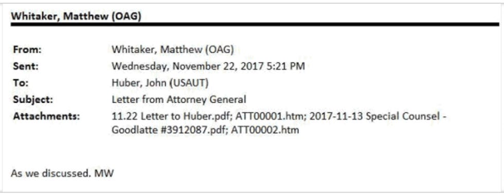 Five minutes before Whitaker noped out of the DOJ for good, the Department magically produced this email to American Oversight, along with Sessions's marching orders for Huber.
