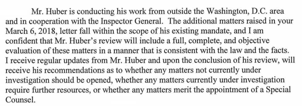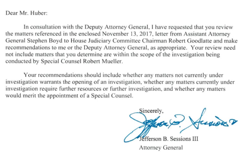 Ever the lickspittle, Sessions obliged , telling then-Chairman Bob Goodlatte and Senate Judiciary Chairman Chuck Grassley that he was putting John Huber, US Attorney from Utah, on the job.