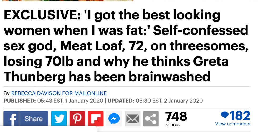 Think about it. Would anyone click on, never mind share, an article about Meat Loaf talking about how he is/was a sex god? Probably not! It certainly would not be trending on Twitter, I can tell you that much. But now, because he said some dumb shit about Greta Thunberg and climate change, thousands of people have read this: