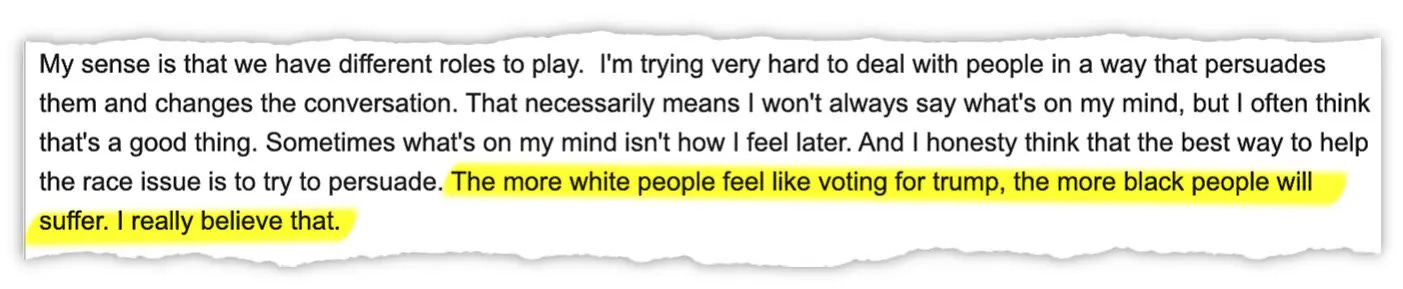The more white people feel like voting for trump, the more black people will suffer. I really believe that.