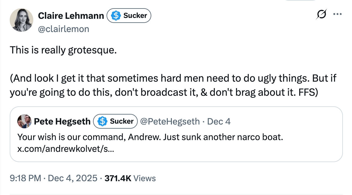 The sadistic nonsense was actually part of a response to equally ridiculous Quillette founder Claire Lehmann, who suggested that Pete Hegseth ought to be less “grotesque” about his war crimes. Not that he should stop doing said war crimes, but that he shouldn’t be so tacky about it.