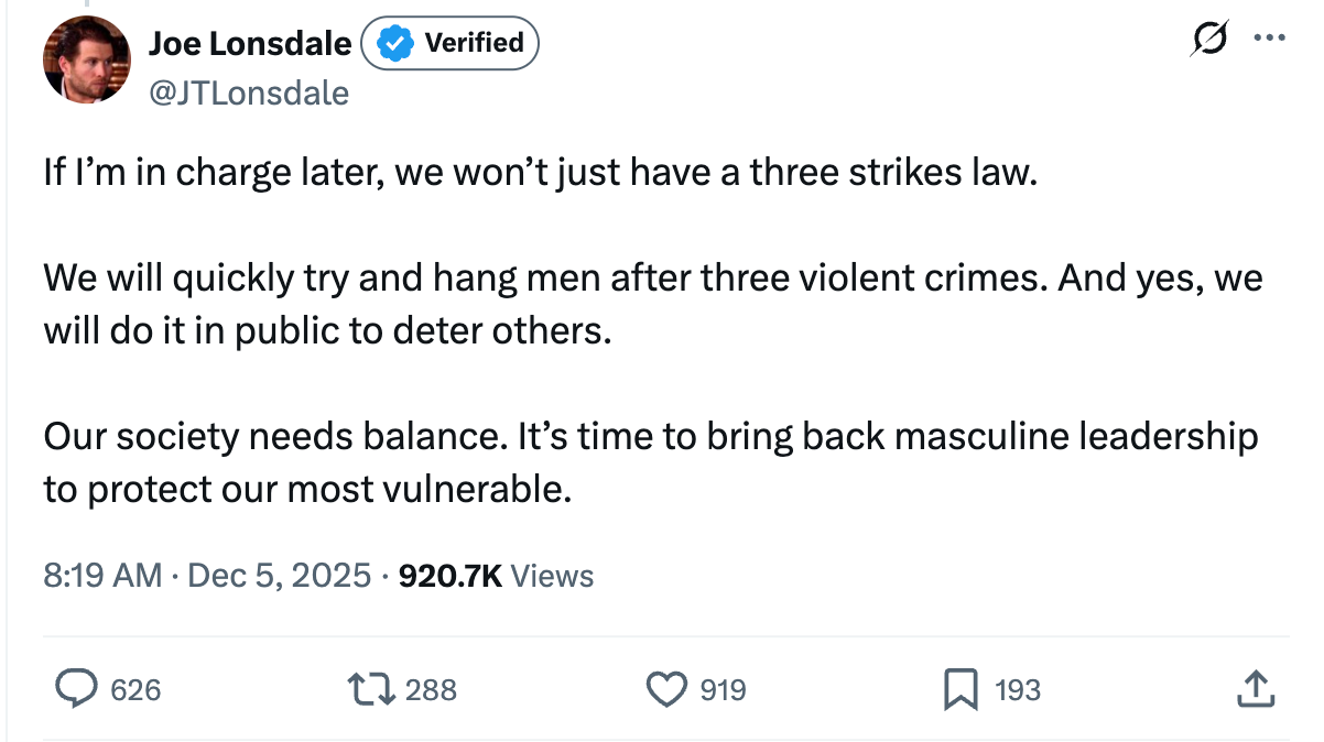 “If I’m in charge later, we won’t just have a three strikes law,” Lonsdale posted on Xitter. “We will quickly try and hang men after three violent crimes. And yes, we will do it in public to deter others. Our society needs balance. It’s time to bring back masculine leadership to protect our most vulnerable.”