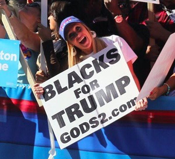 In the last couple weeks, Donald Trump rallies have featured a whole bunch of people waving "Blacks For Trump" signs in the stands behind the Great Man -- sometimes even by black people, but also often held by white people who are obviously very sympathetic to the message, or are every bit as confused as the Texas gent waving an "I regret my abortion" sign at an anti-choice rally a couple years back. But Trump sure is proud of all those folks, who are there to prove the polls are wrong and that the blacks love him: