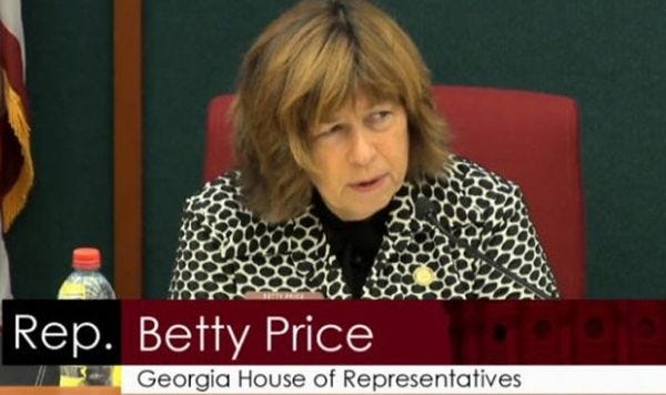 Even though Tom Price is no longer stinking up Congress or the Department of Health and Human Services with that awful jet-fuel smell, there's still a Price in a position to do terrible things to healthcare, at least on the state level. The disgraced HHS head's wife, Betty Price, is a Georgia state representative as well as a medical doctor, and shared some thoughts in a Tuesday meeting of the House Study Committee on Georgians' Barriers to Access to Adequate Health Care. Mostly, she would like to see more barriers for certain Georgians who need health care, because wouldn't quarantining people with HIV save a lot of money, really?