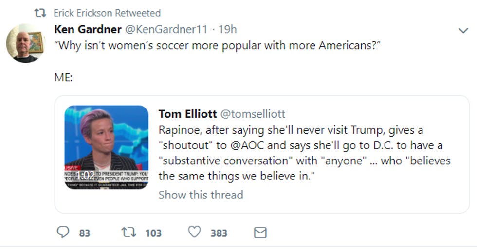 Rapinoe also re-confirmed that she's not going to the fucking White House, her team doesn't want to go to the White House, but they'll go see Alexandria Ocasio-Cortez and Nancy Pelosi and whoever else doesn't suck in Washington: