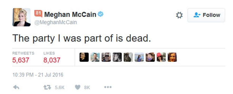 Every so often yr Wonkette likes to check in with its bestest friend in the whole wide Interwebs, Meghan McCain, because she makes the lovely mouth farts and word salads. Now that the GOP's renegade Hate Machine has declared itself Emperor of White Men, and left the streets of Cleveland red with the blood of Benghazi (and Ted Cruz), Megs has come out of right field to offer some opinions on our brave new world. Oh, Meggles, how we've missed you and your strictly dickly feminine wiles!