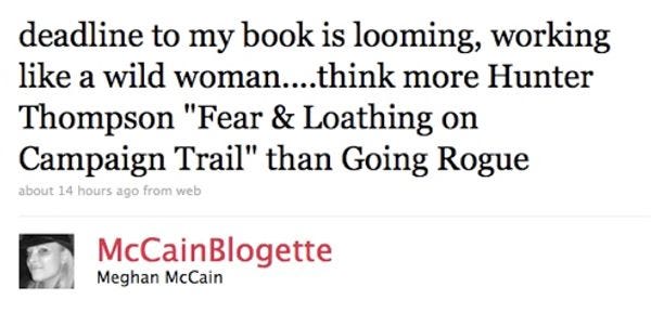 We're trying to ignore Meghan McCain for a while but come on, this is hot news! Her book will be more Hunter S. Thompson than Sarah Palin, okay. Does that line sound familiar? Because it's exactly what James Joyce Twittered as he was finishing up Ulysses in the late 1910s. [ Meghan McCain's Twitter ]