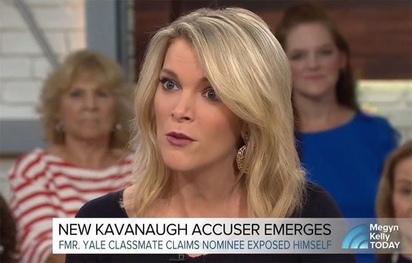 Megyn Kelly is now back in full Fox News Defend All Republicans mode after her brief flirtation with lite morning news-n-talk on her "Megyn Kelly Today" show on NBC. On her program today, she interrupted and yelled at her own panelists to explain that it's NOT FAIR that all these Democrats and women and DEMOCRATS are accusing Brett Kavanaugh of still more sex stuff, because isn't accusing a powerful man of sex stuff when he's facing confirmation to the Supreme Court awfully political, and a total betrayal of the Me Too Movement? You should only accuse powerful men of misconduct when there's no confirmations or elections at stake, because otherwise that's playing politics, we guess.