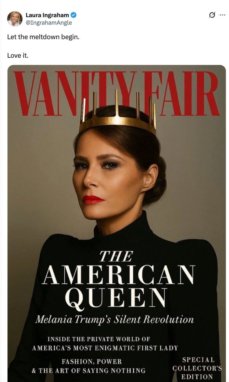 It was so weird that she chose AI to read her audiobook, because what better things does she even have to do all day? Also, it’s so culty how MAGA demonizes immigrants and yet here she is, on a fishy model Einstein genius visa, her accent as thick as it was the day she landed, and they worship her. They even AI’d her on to the cover of Vanity Fair.