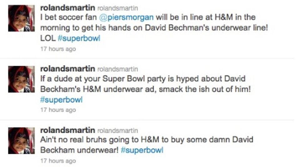 Your Wonkette certainly beat the crap out of its gay male cat after reading these tweets. But was he joking? He was probably joking about beating up people who enjoy David Beckham's underpants, during the Super Bowl.