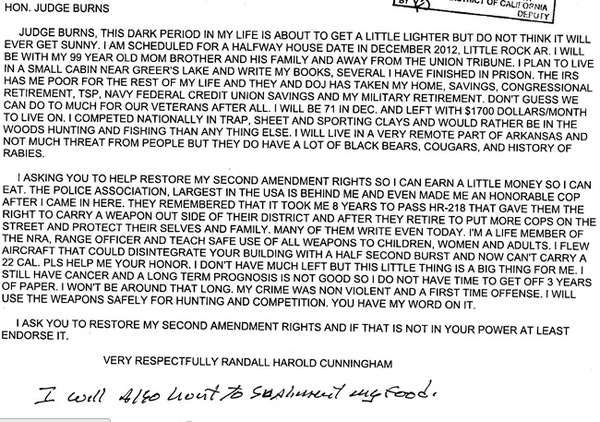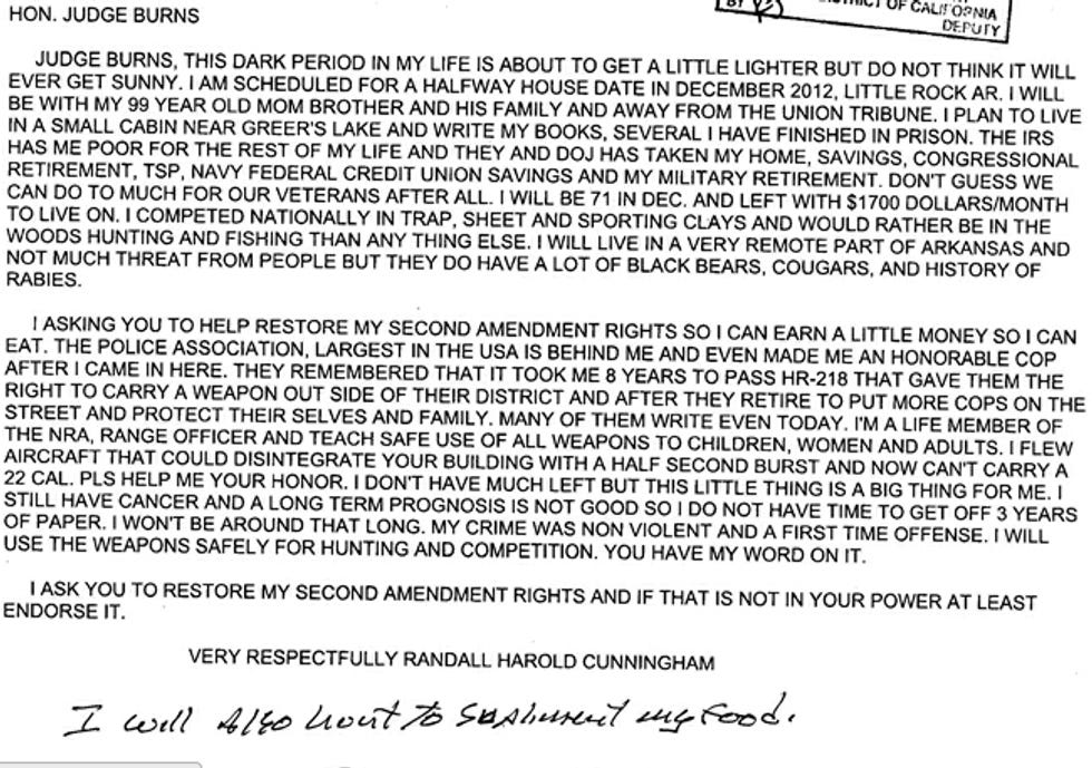 When your Editrix taught political science in the UC system -- Scandal, Politics and the Press, naturally -- she used TalkingPointsMemo as a class text. This was in the heady days of the Duke Cunningham story, first broken by the San Diego Union-Tribune and then ably followed up for months by TPM. Oh, what fun we had with Duke stewing in his nasty boatdeck hot tub, and also drawing awesome diagrams (from memory) featuring all the various skullduggeries of Jack Abramoff and Dusty Foggo! WELL! TPM is still on the case even today, as it lovingly showcases this WAAAAAAH POOR ME letter from the still-incarcerated Cunningham (for those who didn't take our class, he was a Congressman with a special predilection for dirty filthy greasy money, going so far as to have A BRIBE MENU printed up and on-hand) to a judge. What would he like? A gun. Because the UT persecuted him by uncovering his story, the IRS made him poor (by seizing all his Crime Loot), and oh, lots of other stuff too! Let us look on TPM's handiwork in awe and admiration.