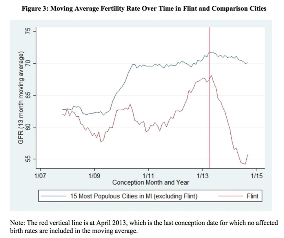 The pipes still haven't been replaced, although the water is supposed to be safe to drink if run through a good home filter. But now we've got more evidence of just how completely Republican officials in Lansing screwed over the (poor, often black) people of Flint: During the period when lead was in the water, the fertility rate in Flint dropped sharply, according to a working paper published last month by health economists Daniel S. Grossman of West Virginia University and David J.G. Slusky of the University of Kansas. How sharply? Women living in Flint had a 12 percent decrease in the "general fertility rate" (GFR) after the change in water compared to nearby areas that didn't have lead in their water.