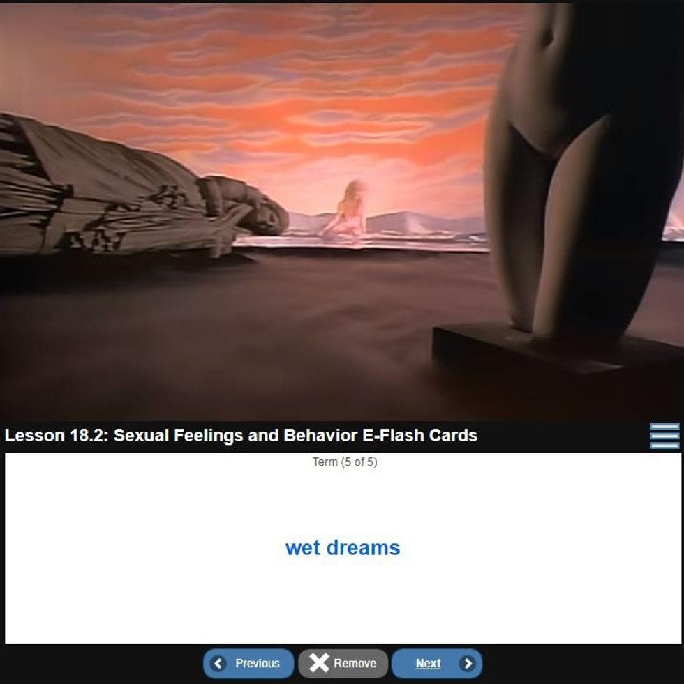 The textbooks, middle school and high school versions of Comprehensive Health Skills , don't deal solely with sexual education, but address a range of health information, including substance use, nutrition, physical activity, and family structures. It also has the sex stuff, and if you would like to snicker like an eighth-grader yourself, feel free to click on this e-flash card from the middle school edition's chapter on "Sexual Feelings and Behavior," which features computer voices saying the words "arousal," "growth spurt," "masturbation," "sexual intercourse," and "wet dreams" as flatly and unsexily as possible. It would be much better with a music video, perhaps.