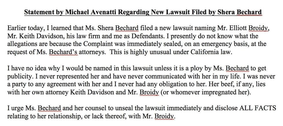 Anyway, as the Wall Street Journal notes, Avenatti seemed to know about the agreement between Bechard and Broidy the night before WSJ broke news of it, tweeting coyly about forthcoming news about an unnamed GOP donor and an "L.A. woman." Again, Broidy says he quit paying because Davidson's leakage to Avenatti rendered the agreement null and void. (This is likely bullshit.) And now Bechard's lawsuit is saying fuck all y'all, and also fuck Michael Avenatti too.