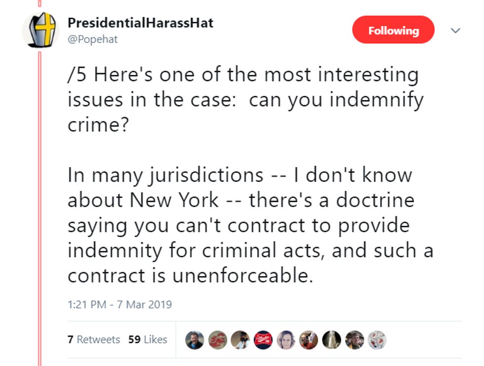In other words, is the indemnification agreement even enforceable, considering how Cohen wants to use it to pay for legal expenses, fines and forfeitures arising from HIS CRIMES? The lawsuit claims it is, under New York law.