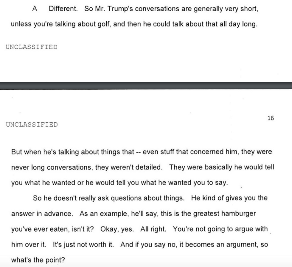 RATCLIFFE: My point exactly. Because you say you spent all day with Trump every day, and yet you never saw any Russian spying. Don't you think you would have known if he was a spy?