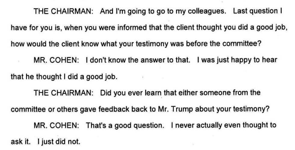 Ratcliffe may be a smarmy little fucker, but he ain't wrong about everything. Walking Michael Cohen through all the allegations in the Steele Dossier and having him deny that he was the mastermind of the whole Russian ratfucking operation is pretty effective. Either Michael Cohen is the best actor in the world, or he's kind of a schlubby hustler.