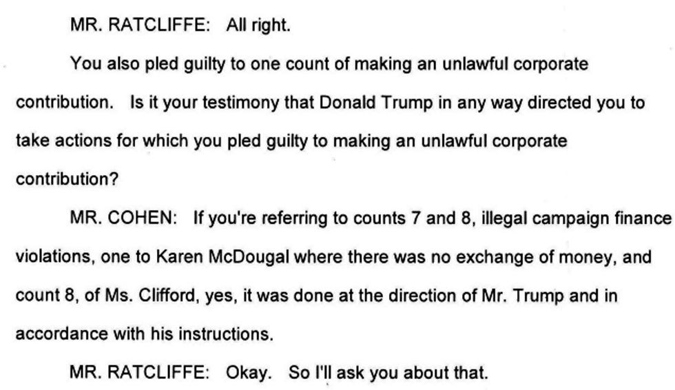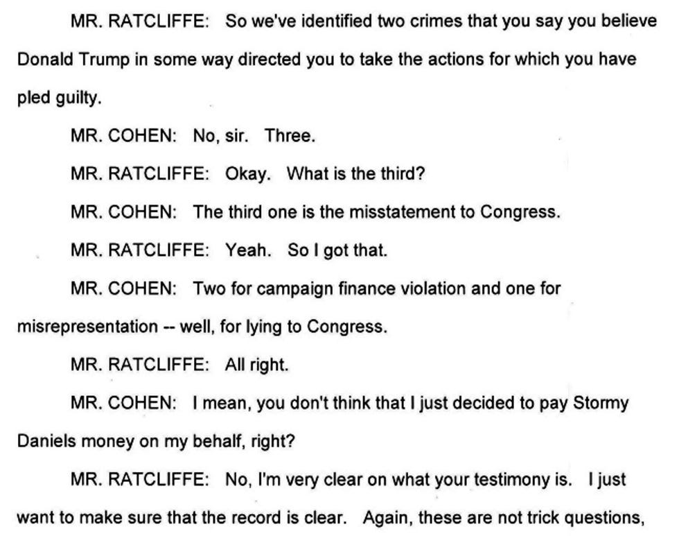 Then Ratcliffe asked Michael Cohen how Donald Trump could be at fault for a check Michael Cohen wrote to himself to pay him back for the Stormy Daniels payout. Yeah, sound it out ... and then you'll know how we feel reading a hundred pages of Congressman Dipshit trying to do GOTCHAS and getting his ass kicked by Cooley Law's most famous disbarred graduate.