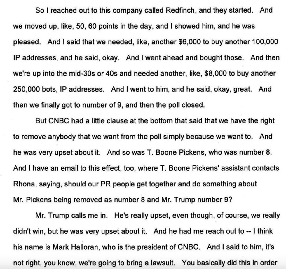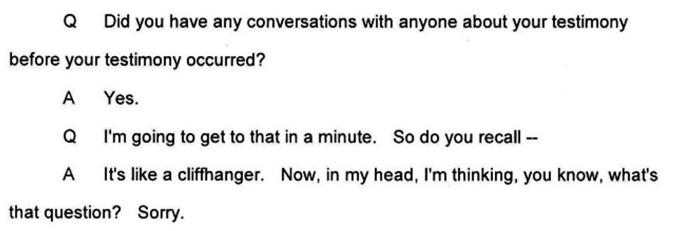 Goldman, being an IRL lawyer, is working to establish that Trump's M.O. isn't to say, "Tell this lie." Rather he states his version of the truth, and everyone is expected to repeat it like trained seals.