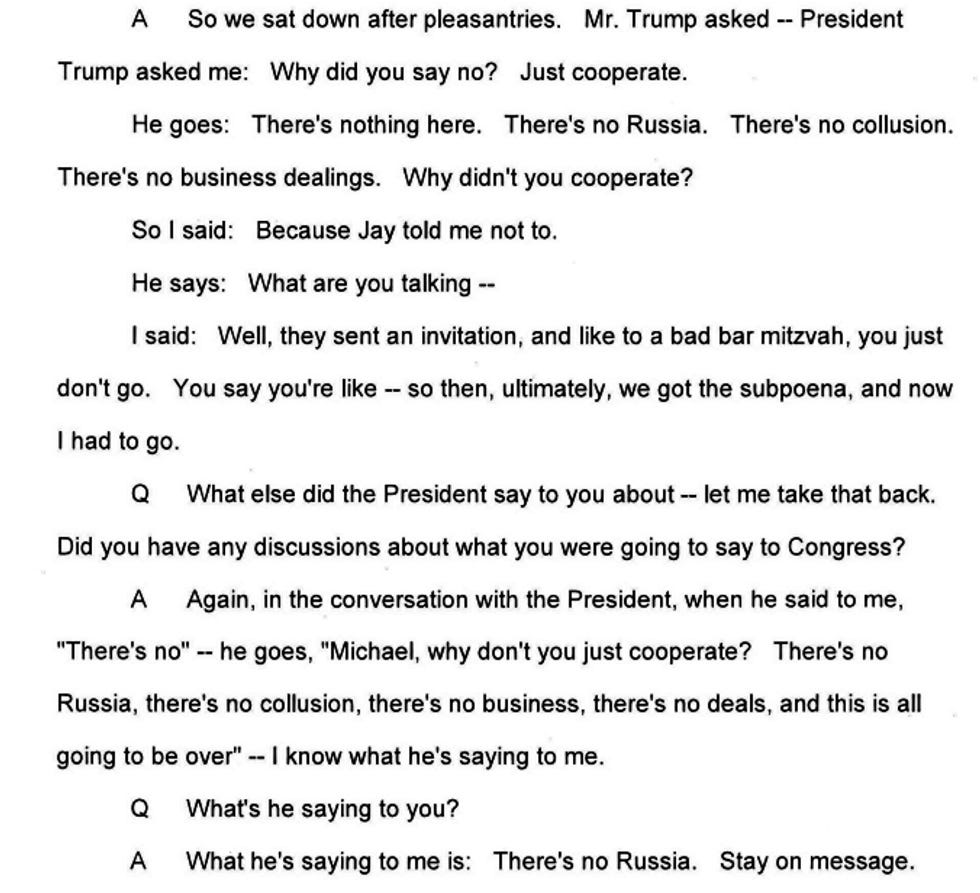 COHEN: We talked about staying on message. And the message was always was whether I was -- when I was with Mr. Trump or during these conversations, it was always about to stay on message, which is there's no Russia, there's no collusion, there's no business deals. And that was the message that we were staying on. And that was the message that I was going to put into the statement, and -