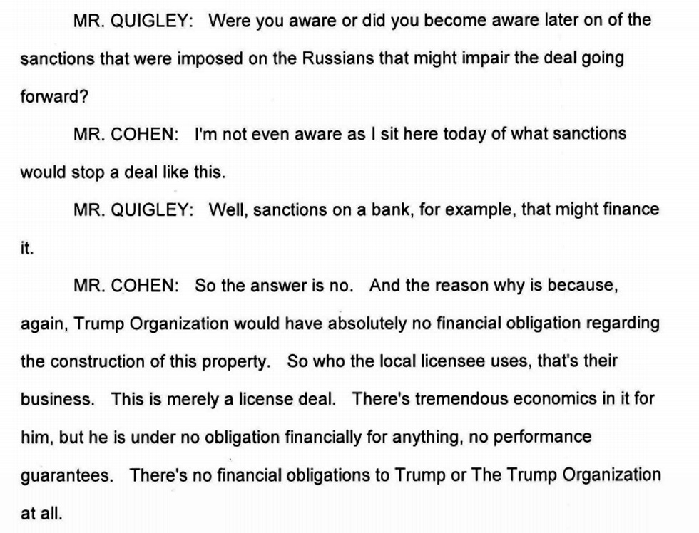 We have said one million times that it was ALWAYS about the sanctions. And we're sticking by that one -- that was Russia's overriding goal. But perhaps Robert Mueller was right, that none of the Trumpers had enough brain cells to form the requisite intent to collude. According to Michael Cohen, the Trump Organization was totally kosher to do license its name for a project in Moscow financed by a sanctioned Russian bank. WHY EVER WOULD IT BE A PROBLEM to do business with people the US Treasury explicitly makes it a crime to do business with?