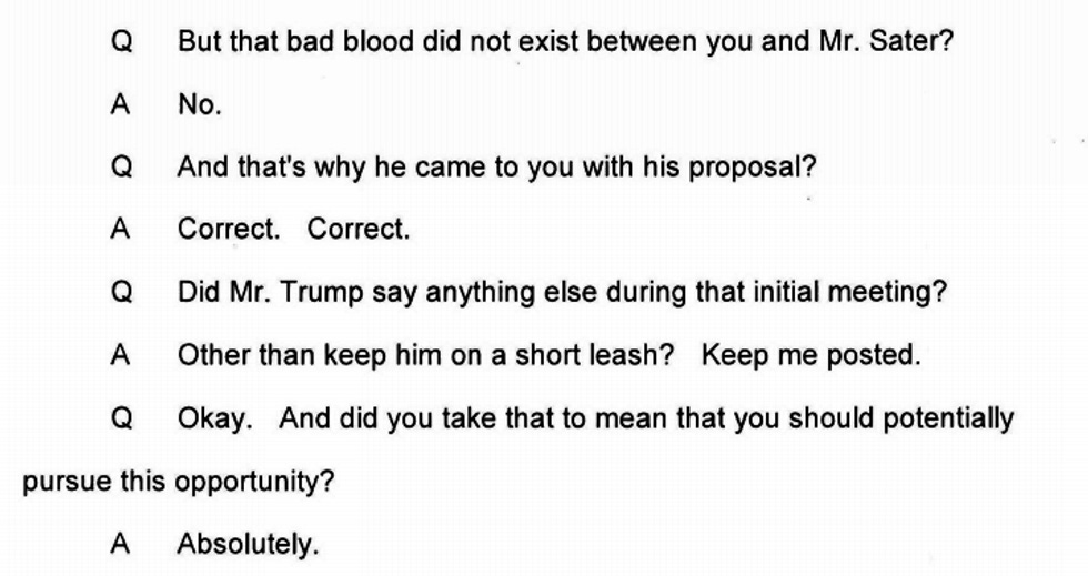 Have we neglected to give you page numbers? Sorry 'bout that! Around page 30 is where they get to discussing the origins of the Trump Tower Moscow Deal. Apparently, Felix Sater -- the Forrest Gump of American foreign policy , who has been a federal cooperator for like 20 years and helped lead the feds to Bin Laden -- had some bad blood with the Trumps.