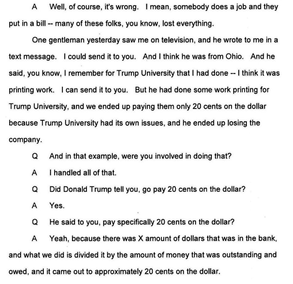He makes sure that all the creditors of Trump University take 20 cents on the dollar, and are bloody grateful to get it.