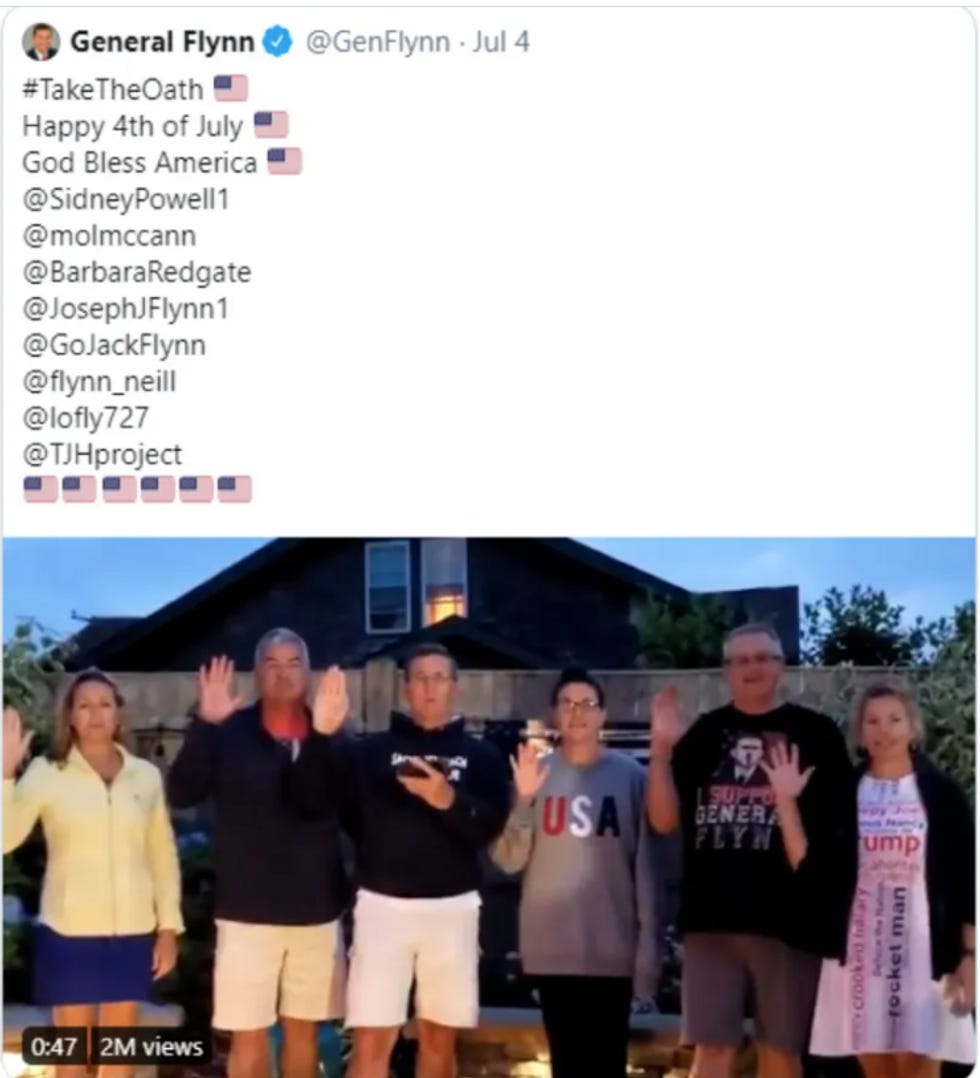 Here is the video of the Flynns saying this thing that may or may not be the QAnon oath. Tell you below why we now say it may or may not be the QAnon oath, even though it totally is and tons of QAnon crackpots were reciting that shit last summer. There literally was a Q drop telling people to take this very oath, mere weeks before this video was posted.