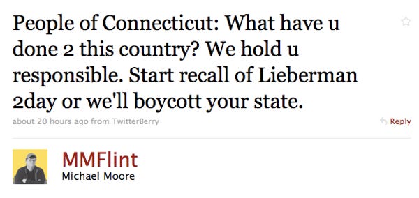 Michael Moore Declares One Of His Michael Moore Wars On ConnecticutJuli WeinerDec 17, 2009ShareEh. Needs more salt . [ Twitter via The Hill ]Want to just donate once?PreviousNext