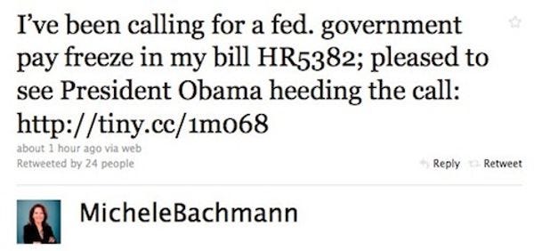 Guess who loves that pay-freezing Kenyan socialist Barack Obama? Crazy teabagger Michele Bachmann, that's who! She can't wait to visit the White House and give Barack a big perfume-y hug now that he's the new Ronald Reagan. Yay everybody! [ Michele Bachmann's Twitter ]