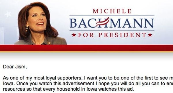 According to this important email from Michele Bachmann's campaign, she is going to win Iowa and then whatever other states are part of America. She is a uniter, not a divider! (As long as you're an "ex-gay" who helps her collect foster-parenting money, as a "small business.") And this strategy is working with the nine Republicans in Iowa currently paying attention to the presidential election, which takes place in exactly a year-and-a-half from now.