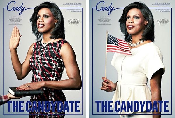 You are of course familiar with Candy magazine, America's first and most beloved "transversal style" periodical. (Not to be confused with Candy magazine , the magazine dedicated to Filipino youth.) Previous Candy covers have featured James Franco and Chloe Sevigny in drag because hey, why not? Those people are super boring, though, compared to this month, which stars our famous FLOTUS , Michelle Obama! No, not actual Michelle Obama, although we must acknowledge the excellent wardrobe (note sleevelessness!). The cover reads, "THE CANDYDATE," so we guess Michelle Obama is running for office and didn't bother to tell anyone except our nation's first transsexual magazine.
