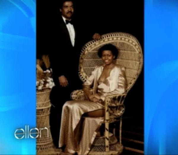 Everything was going great with the women and the men, who stopped fighting against women/each other this weekend just long enough to watch 'Shark Tank' and eat a few hot dogs, but now Michelle Obama has something to say. It is a picture, which as you know can say a lot, especially if the picture is of a lot. It is this, a picture from her high school prom. And in it she looks like a movie star on a trip to India or something. The wicker chair. The prop stylist on this Whitney Young High Prom '81 photo shoot had a gift. The First Lady shared this photo on, WHERE ELSE, blasphemous variety program 'The Ellen DeGeneres Show,' on which a homosexual woman is said by critics to "only encourage" people to be themselves, high dress slits and all.