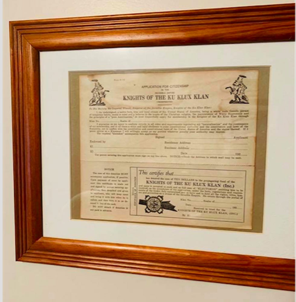 There were even more horrors waiting for Mathis in the bedroom, and we don't mean the cramped, non-functional master closet. He found to his "surprise" a framed "Klu Klux Klan" application hanging on the wall. We confess we didn't realize the Klan had literal applications, as if there were a head of inhuman resources screening them for minimum requirements and red flags (e.g. the applicant is black or Jewish). We assume there are sections for describing how much you resent race mixing and listing all your "special skills" (hating, discrimination, Excel).