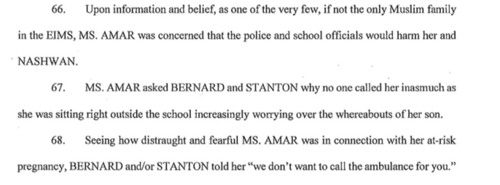 The whole time, Nashwan's mother, Ubaisha Amar, who was pregnant at the time, was waiting outside the school to pick him up. The suit alleges the administrators refused to let Nashwan call her, and that they also ignored numerous phone calls and text messages from her asking where he was. The school called the police, who spoke to Nashwan -- again without his mother present -- and allegedly told him "this is bad." After signing the "confession" and being questioned by the cops, Nashwan was allowed to answer his mom's phone call, and she was told to come to the principal's office, where Stanton started in on her, because of course she's a bad mom who raised a confessed terrorist: