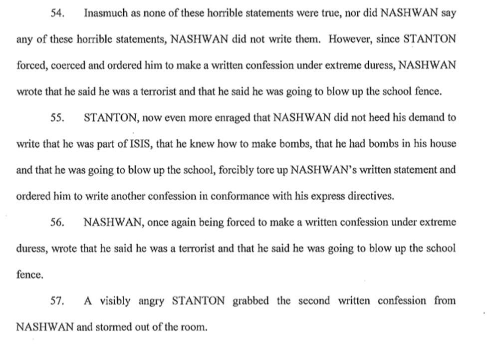 After the vice principal left, Principal Bernard allegedly searched Nashwan's belongings and demanded he sign a confession, which seems like maybe it might be exceeding the authority of a middle school principal. Hahaha, no, we have known middle school principals who would totally do that. (NB: most are wonderful people and would not. But we've all encountered the kind of middle-school tinpot dictator who would.)