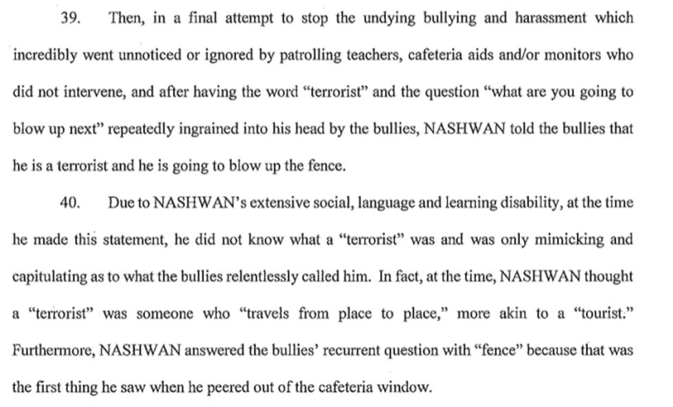 You'll want to read the full story at Fusion, but here are the basics of the January 6 incident: Nashwan Uppal, a seventh-grader at East Islip Middle School, was in the school lunchroom when a group of older students began taunting him, calling him a terrorist, and asking him "what he was going to blow up next." Nashwan, who's Pakistani-American and suffers from "learning and communication impairments," tried to move to another table. The bullies followed and kept verbally harassing him, continuing with the hilariously funny comments about him being a terrorist and demanding he tell them what he planned to blow up. According to the lawsuit, he didn't even know what "terrorist" meant, but eventually, in an effort to make the bullies go away, told them he was a terrorist and would blow up a school fence: