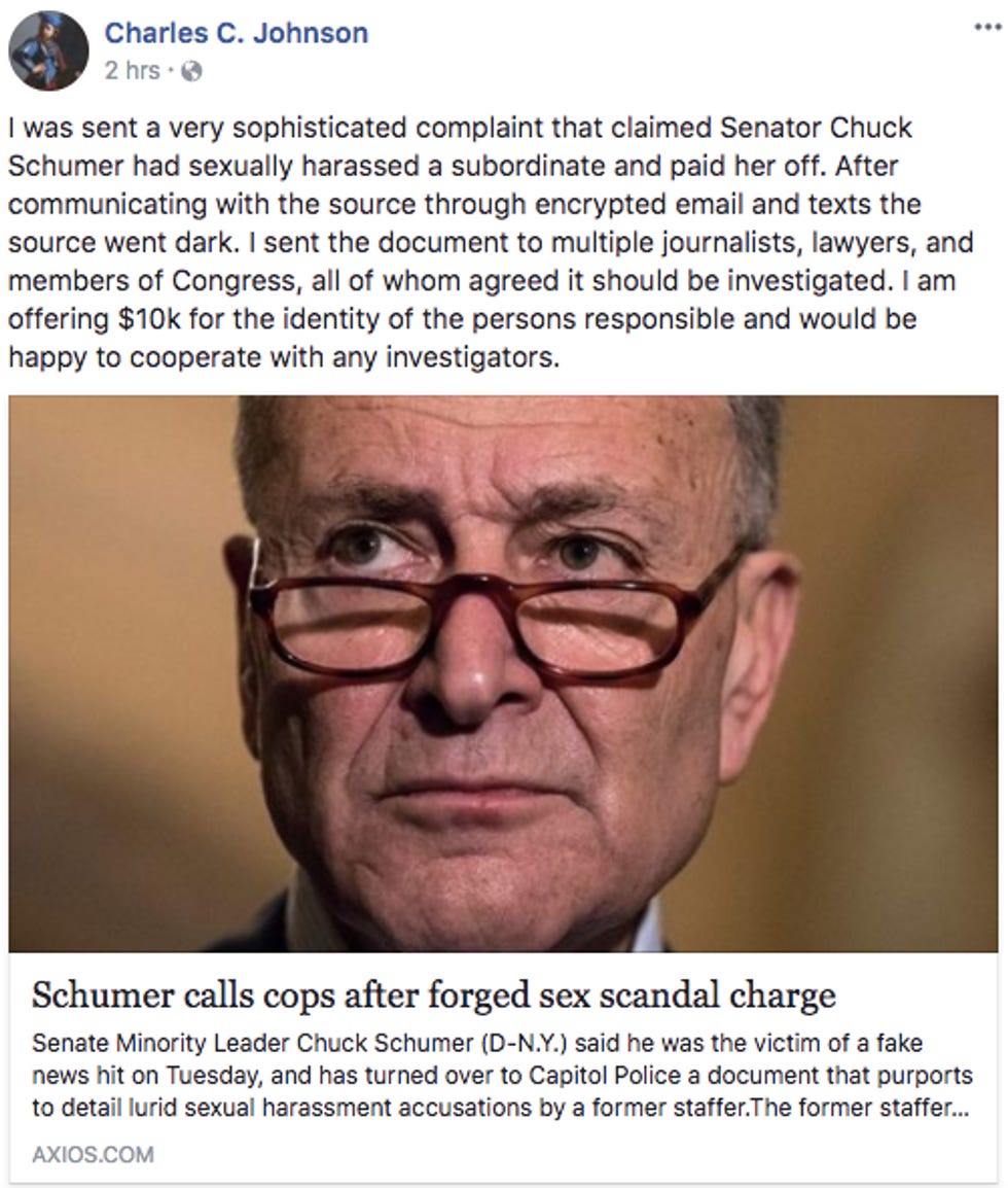 Move over, James O'Keefe! There's a new scammer in town and his game is forgery. We don't know his name yet (and maybe he's a she!), but some merry prankster has been shopping around a fake sexual harassment complaint against Senator Chuck Schumer (D-Come at the King, Best Not Miss). Axios reports that someone has been approaching DC news outlets with a 13-page PDF purporting to be an unfiled lawsuit from 2012 by a member of Schumer's staff.